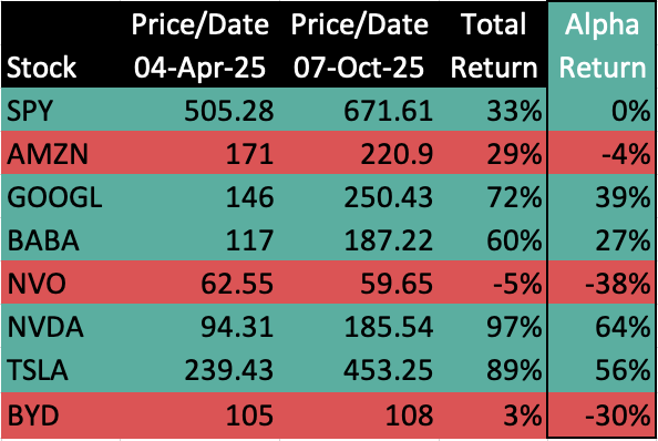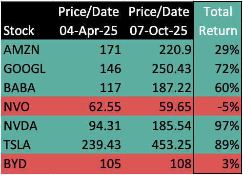 Let me tell you what I did.  Back in April, during the tariff shock chaos, I said I was buying.  Click here to read that post/watch that video.  I would continue to do so if the market pulled back further.  My two top stocks AMZN and GOOGL and other names BABA, NVO, NVDA, TSLA, BYD.  Fast forward six months and those stocks look like they’ve had a triple espresso! Now feel free to pause the screen to look closely at performance of those stocks from that post/video 4th of April.  You can see total returns look great to today although it is important to reference returns against a benchmark like the S&P500.  So now you can see the actual outperformance relative to the market is less amazing but still extremely good in many of these stocks.